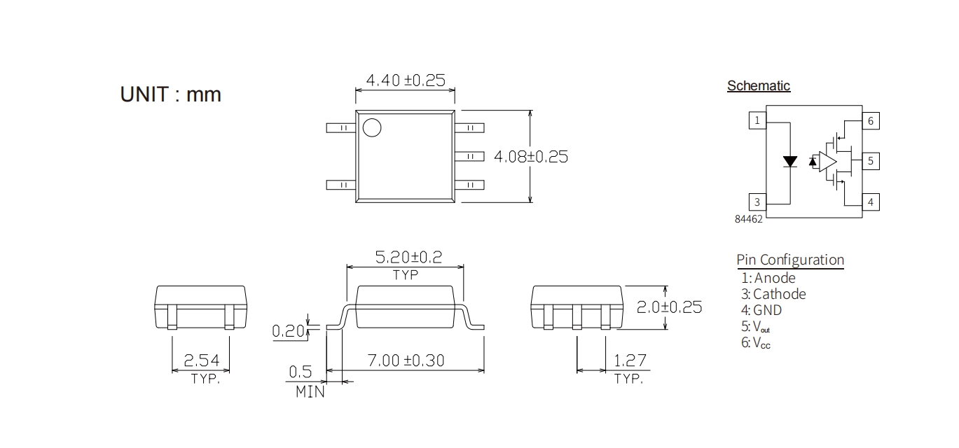 | Product | Package | size(LxWxHmm) | Data Transfer Rate (Mbps) | Supply Voltage(V) | tPHL(ns) | tPLH(ns) | IFT (mA) | CTR(%) | CMR(V/us) | Io(mA) | Topr (Min) (degC) | Topr (Max) (degC) | Viso (Vrms) |